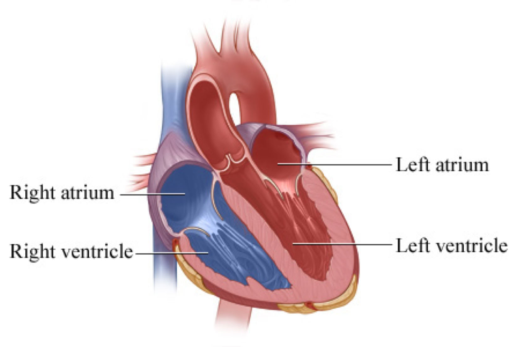 The four chambers consist of the right atrium and left atrium, and the right and left ventricles.