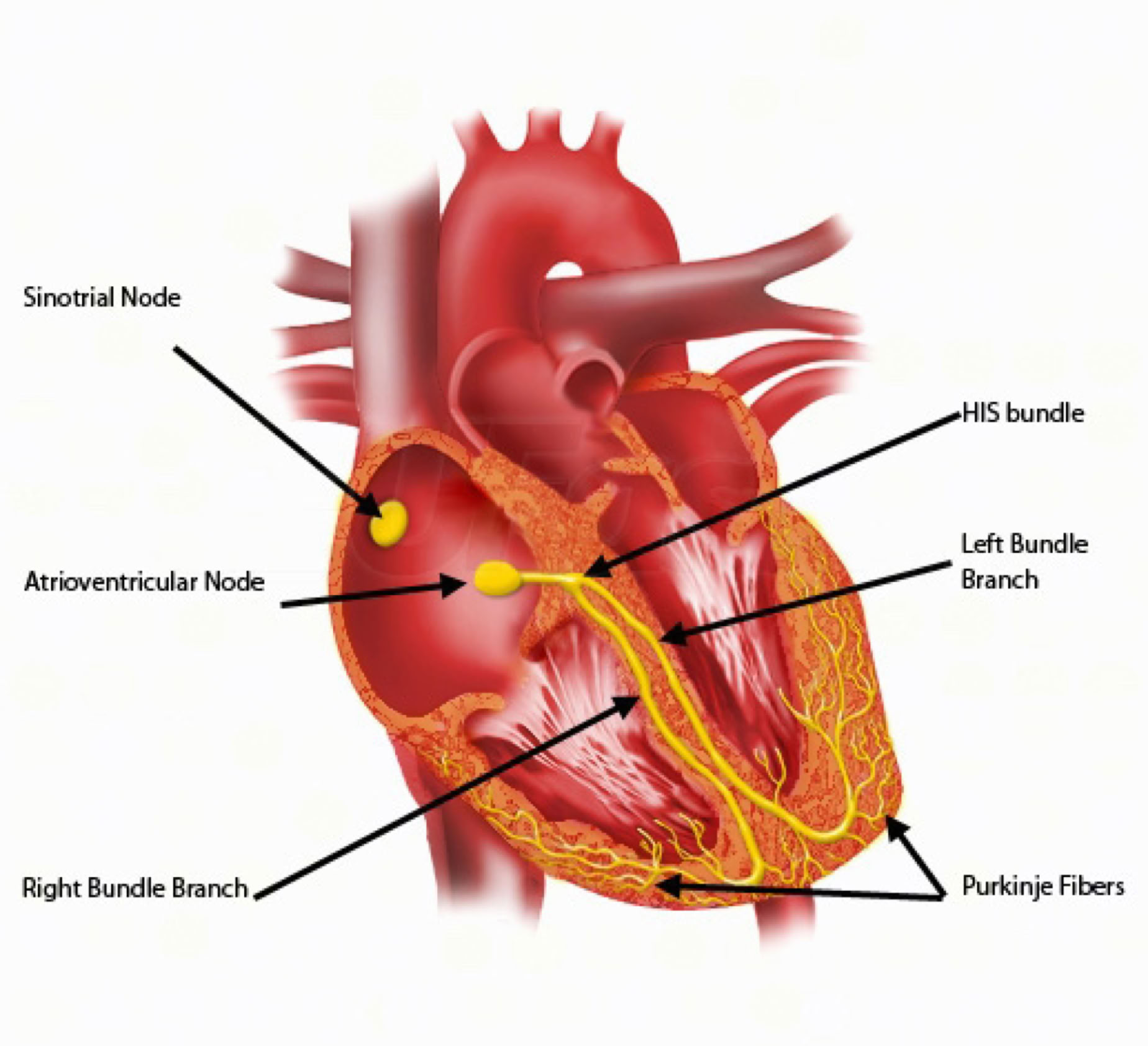 Depolarization continues toward the apex of the heart through the bundle of His and the left and right bundle branches until it terminates in the Purkinje fibers.