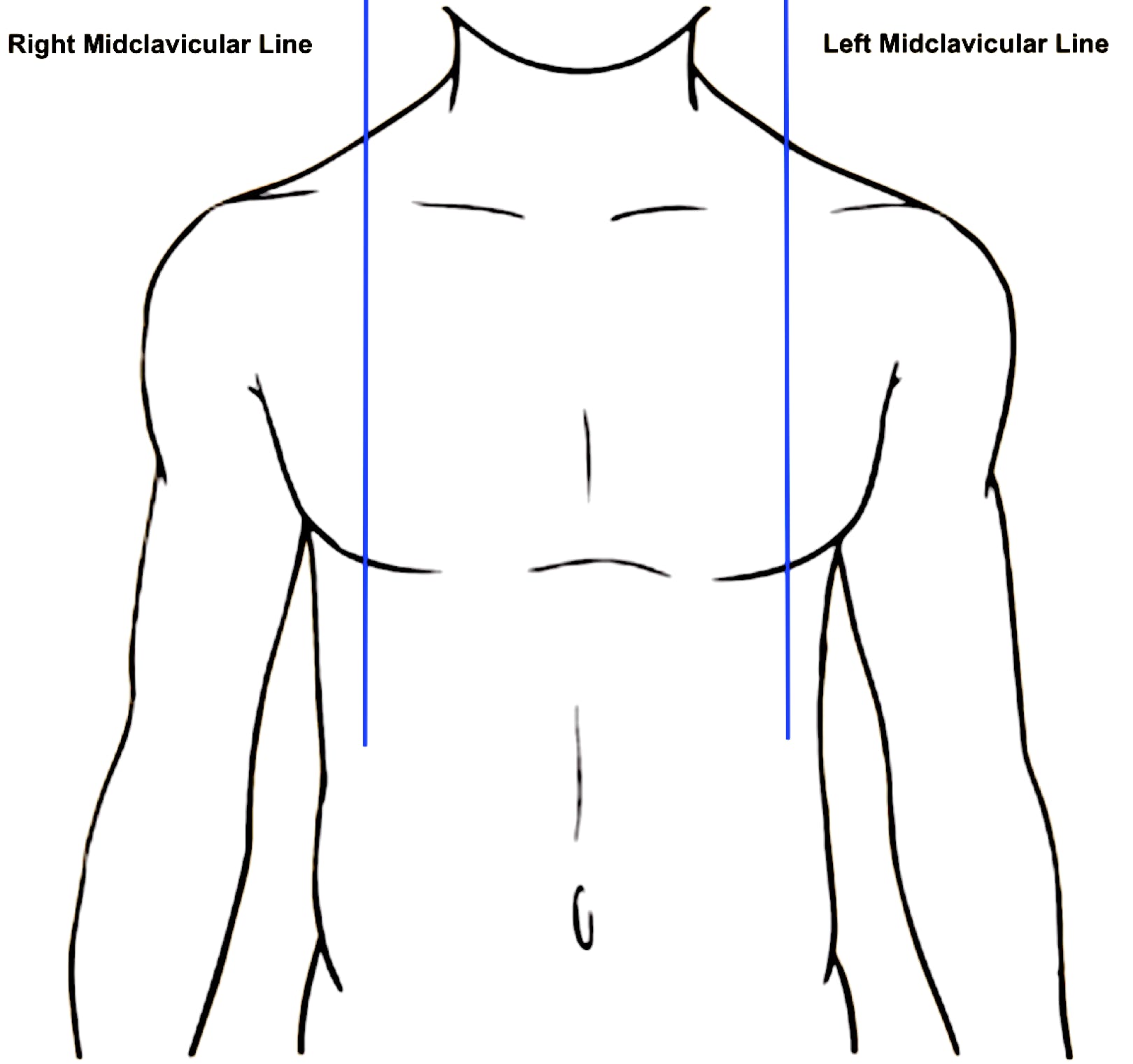 Midclavicular line: imaginary line parallel to the midline and passing through the midpoint of the clavicle on the anterior surface of the body.