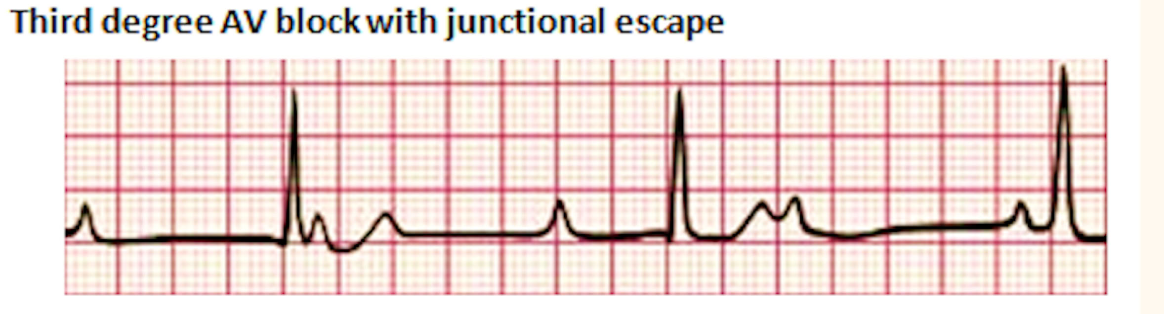 Ventricular escape beats: also, will have a widened bizarre QRS complex.