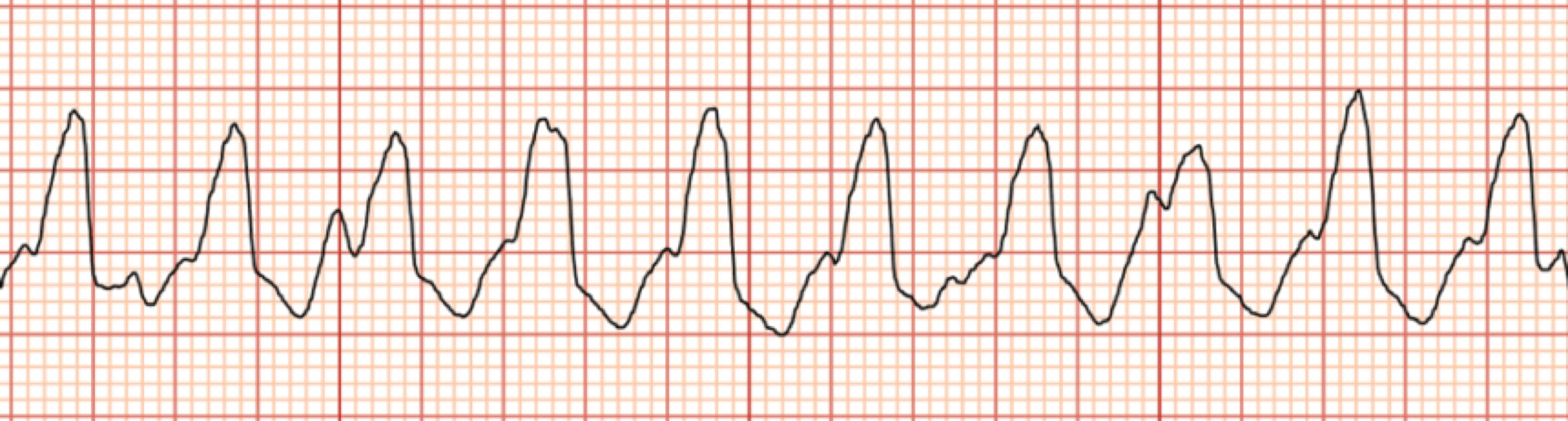 The tracing shows a wide, unusual QRS complex with no P or T wave.