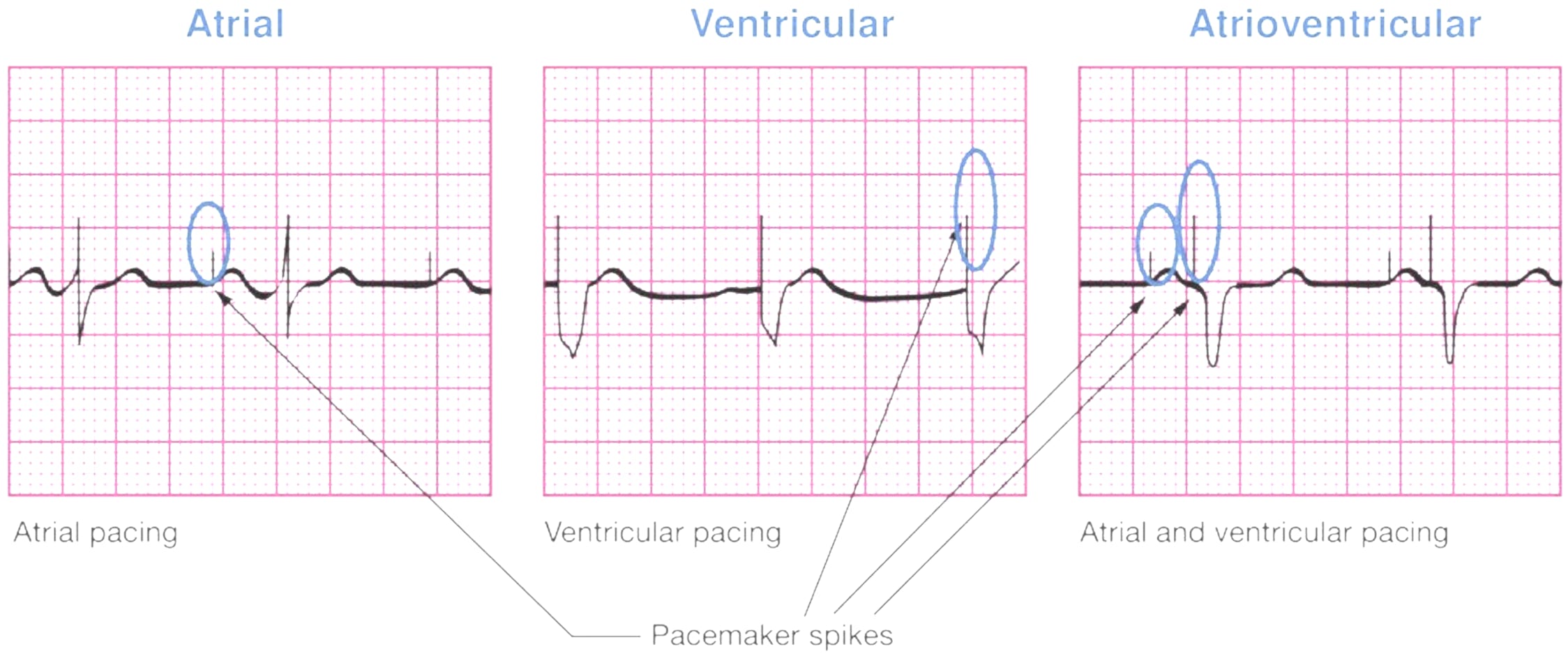 Pacemaker spikes: Pacing spikes are artifact in a EKG tracing that are a result of the electrical impulse produced by an artificial pacemaker.