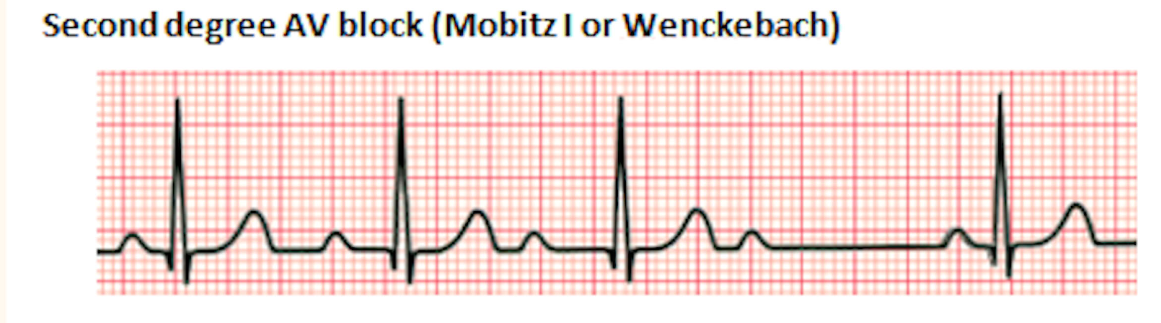 In the Mobitz type I the P-R interval of the conducted beats get longer and longer until a beat is totally blocked.