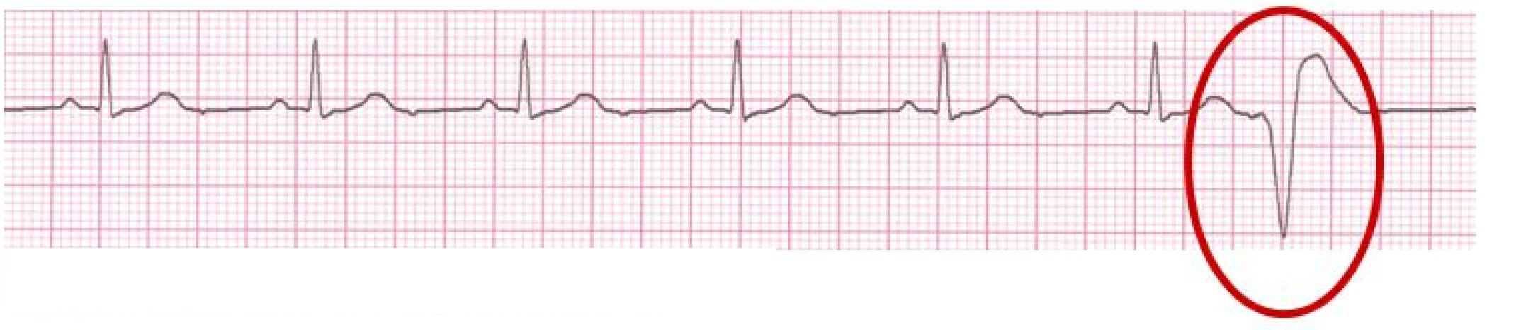 PVCs are ventricular depolarizations that occur early in the cardiac cycle. The characteristic findings on the EKG include: