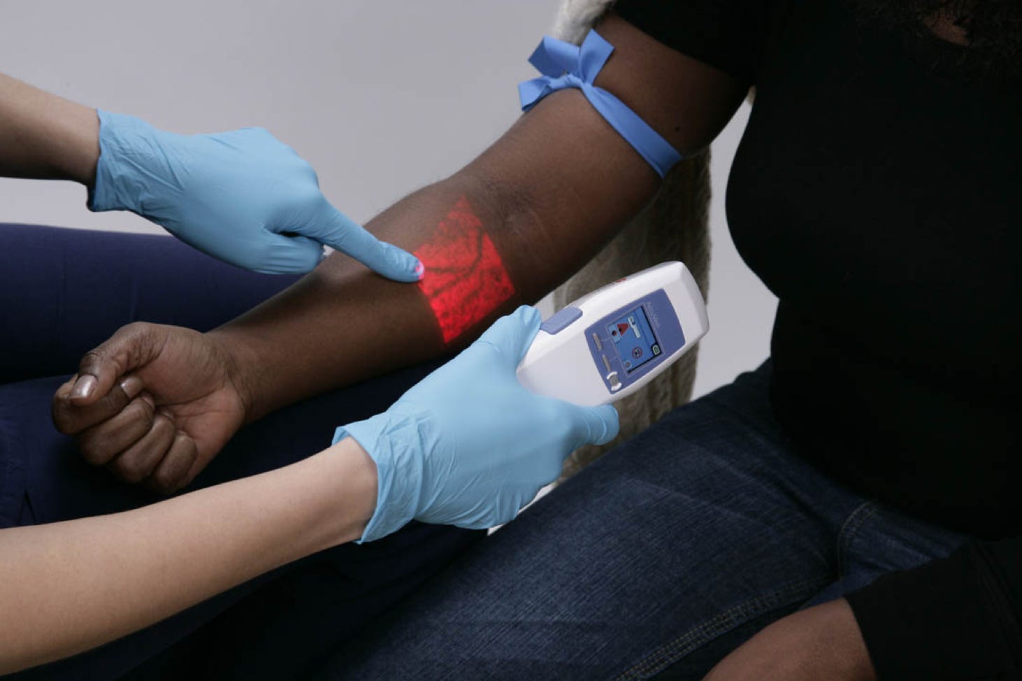 Devices are available that shine a bright light through the patient's skin. When such a device is positioned properly, veins are visible as dark lines within the tissue. This works especially well for finding veins in the hand and foot. Transillumination shines high-intensity LED or infrared light and highlights veins in patients subcutaneous tissue