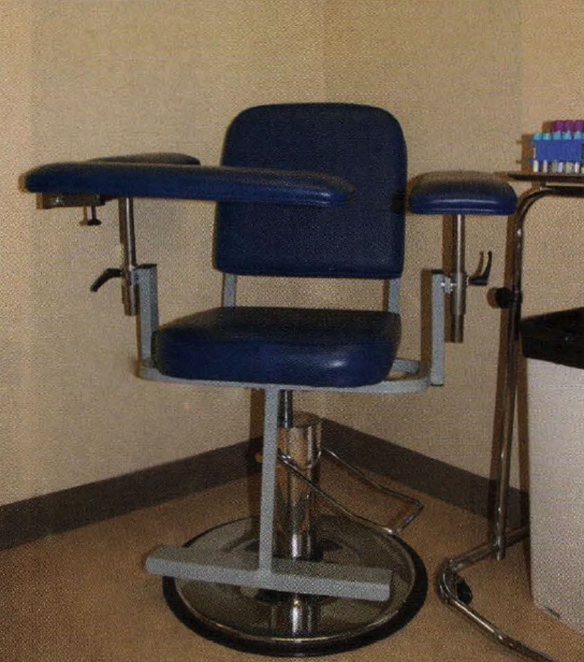 with an adjustable armrest. The armrest locks to prevent the patient from falling out in the event of fainting. A bed may also be available for patients with a history of fainting . Supplies may be available at the drawing station, or you may need to bring your tray to it.
