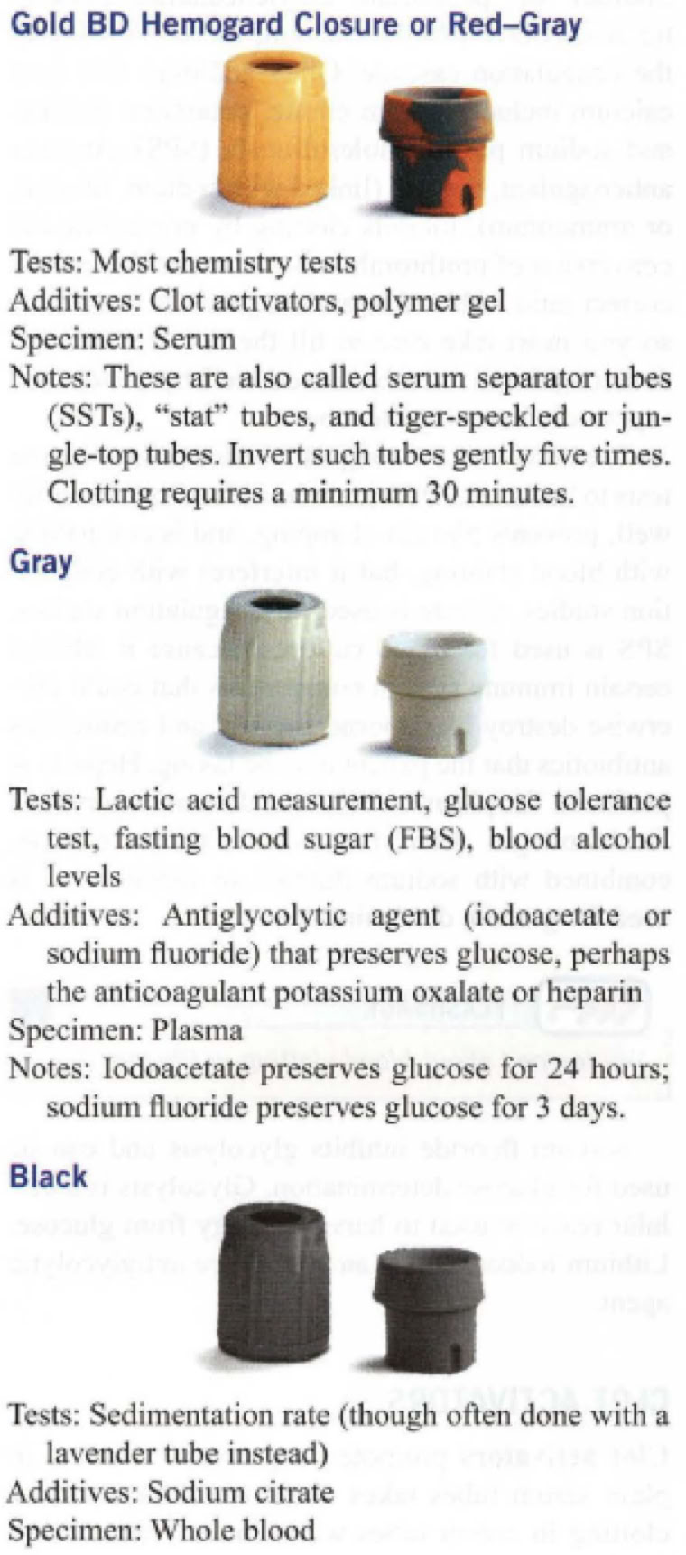 Except for the glass red-topped tube, which has no additives, all tubes contain one or more additives. Additives include anticoagulants to prevent clotting, clot activators to promote it, thixotropic gel to separate components, and preservatives and inhibitors of various cellular reactions to maintain the integrity of the specimen.