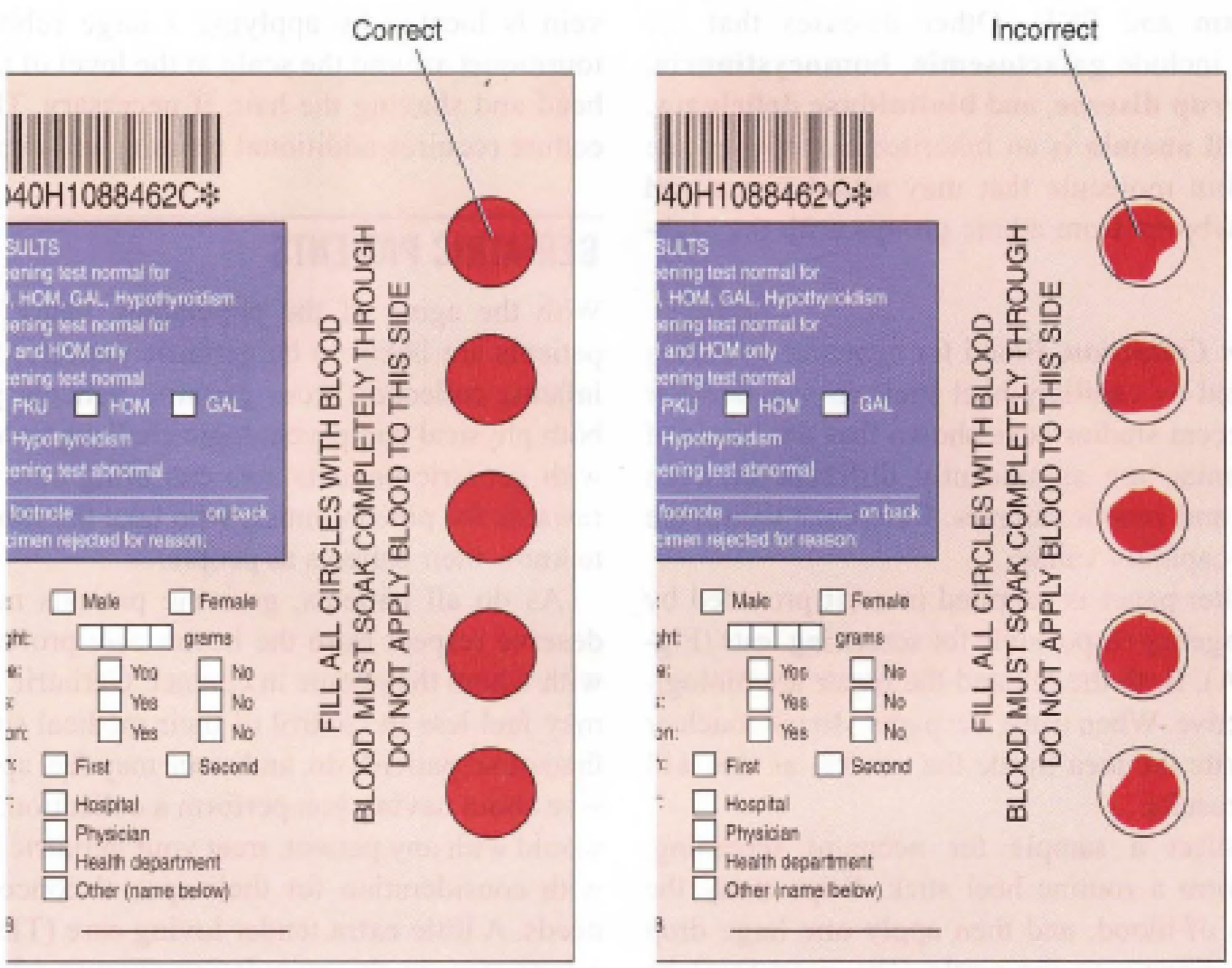 To collect a sample for neonatal screening, first perform a routine heel stick. Wipe away the first drop of blood, and then apply one large drop of blood directly to the circle.The drop must be evenly spread. Although applied to