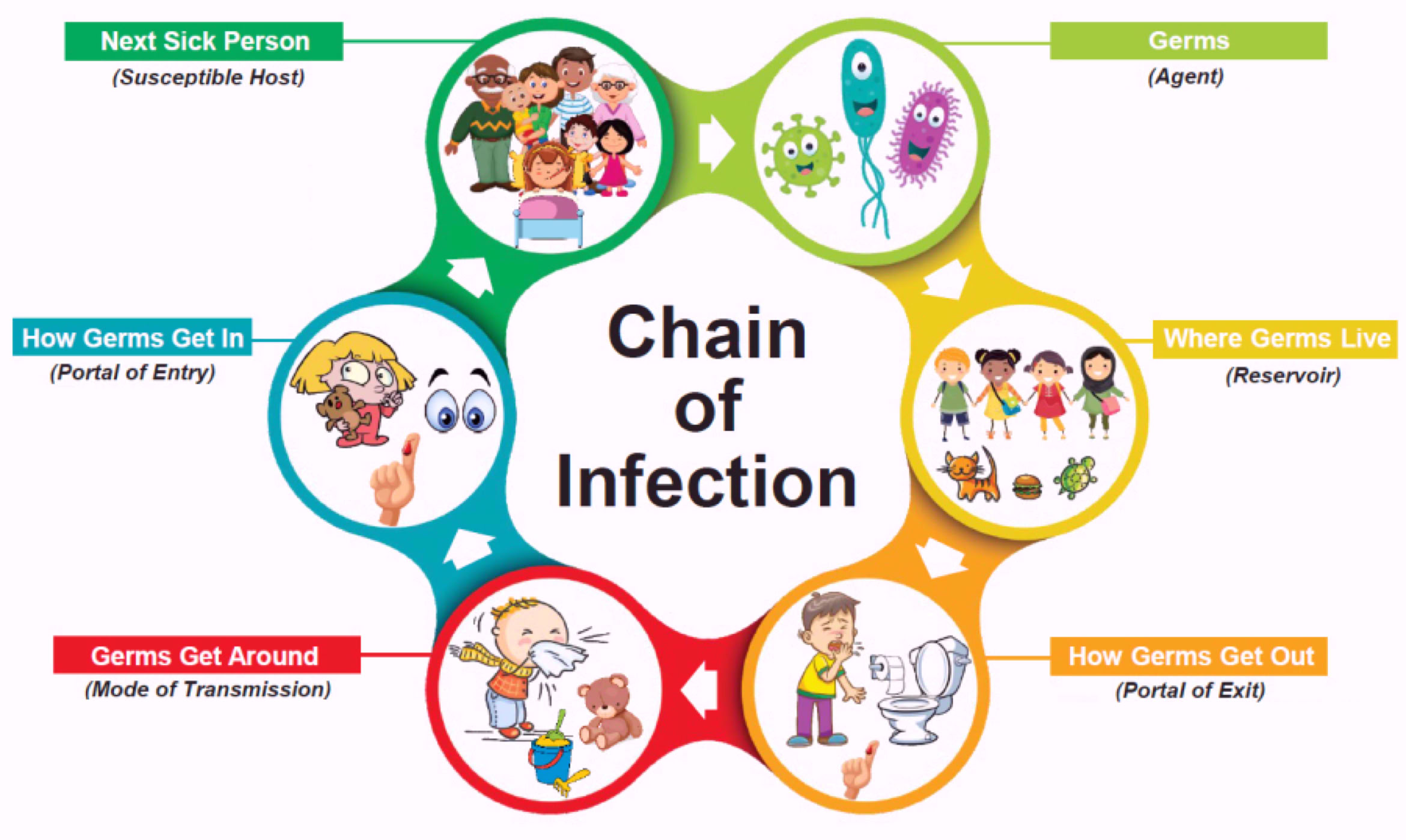 For an infection to develop, each link of a chain must be connected. Breaking any link of the chain can stop the transmission of infection