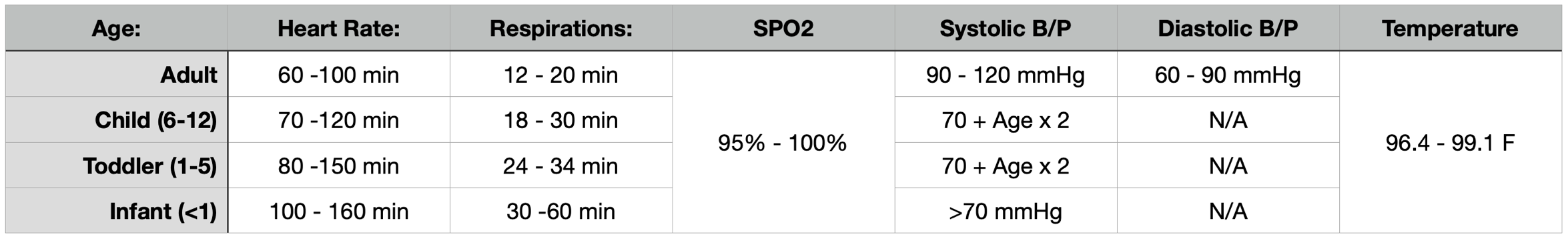 It is important to know the range of vital signs for all age groups. As a EKG Technician you must report vital signs that are outside the expected range to clinical staff. The table below summarizes normal vital signs for multiple age groups.